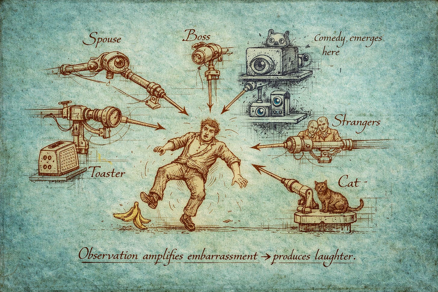 Humor doesn’t happen from you slipping on a banana. It happens when you fall on your butt on a crowded sidewalk. Embarrassment requires an audience. Humiliation requires a witness. The chasm between the bullshit you’re trying to project and what everyone can clearly see is where comedy grows. And that chasm becomes a crack if nobody’s looking.